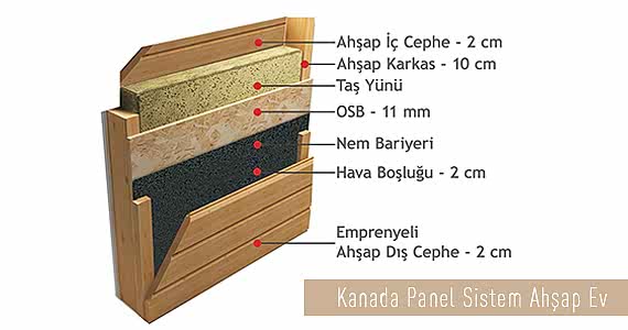 Duvar kalınlığı 17 cm’ye ulaşan Kanada panel sistem ahşap evlerde duvar kesintinin içerisinde izolasyon malzemeleri bulunmaktadır. Yan taraftaki resimde de görüldüğü gibi emprenyeli ahşap karkas arasına taş yünü, iç ve dış cepheye doğru ahşap kaplama, arasında nem bariyeri bulunan duvar kesitleri ve ısıcam pencere sayesinde konutun içerisi çok rahat bir şekilde ısıtılıp soğutulabilmektedir. Duvar kesitinin içerisinde bulunan nem bariyeri sayesinde nemi içeri almaz ve iç mekanda 4 mevsim boyunca rahatlıkla doğal yaşamın keyfini çıkarabilirsiniz.
